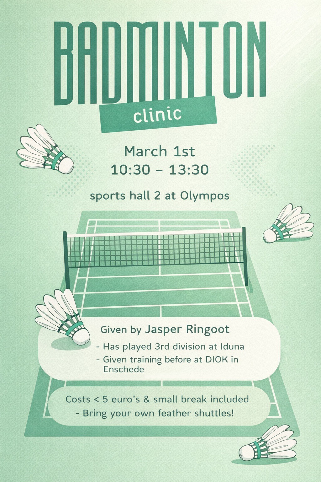 Ontwikkel je badmintonskills tijdens de badminton clinic. Jasper, voormalig 3e divisiespeler leert je alle tips en tricks!